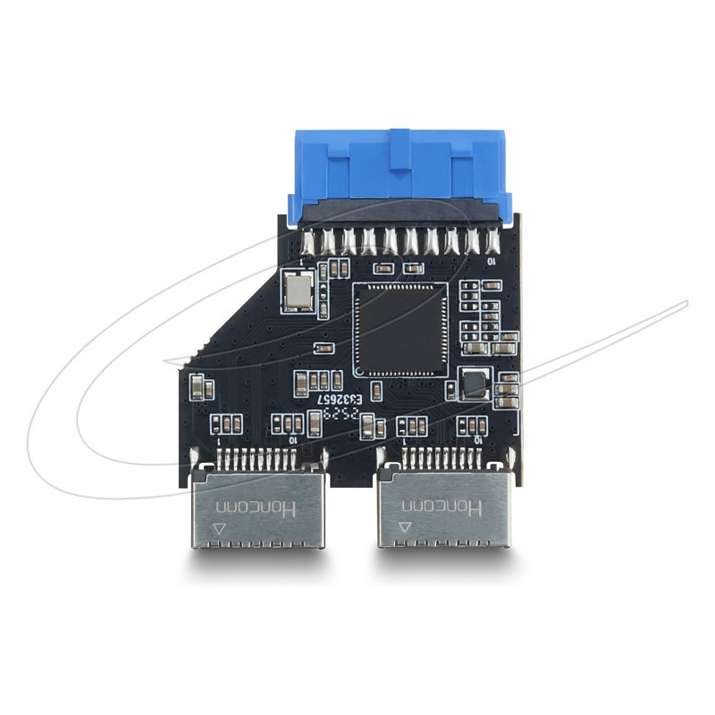 "DeLOCK 67342. Connector 1: USB 5 Gbps 20 pin header, Connector 2: 2x USB 5 Gbps 20 pin header. Product colour: Black, Blue"\n"This hub by Delock allows to split an internal USB 5 Gbps pin header into two USB Type-E Key A female. This allows modern front panel connections or internal USB devices to be connected directly to the motherboard. Ideal for cases, custom-built PCs and embedded systems."