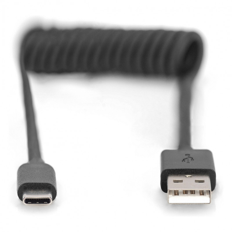 "Digitus USB-A - USB-C spiral cable, 1m. Cable length: 1 m. Connector 1: USB A, Connector 2: USB C, USB version: USB 2.0, Maximum data transfer rate: 0.48 Gbit/s, Connector contacts plating: Nickel, Product colour: Black"\n"Flexible and heavy-duty spiral cable for charging and synchronizing