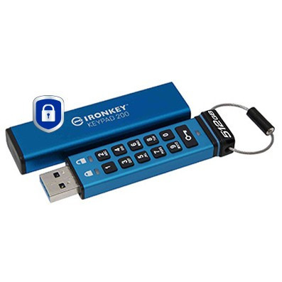 "Kingston Technology IronKey 512GB Keypad 200, FIPS 140-3 Lvl 3 (Pending) AES-256 Encrypted. Capacity: 512 GB, Device interface: USB Type-A, USB version: 3.2 Gen 1 (3.1 Gen 1), Read speed: 280 MB/s, Write speed: 200 MB/s. Form factor: Sleeve. Keypad integrated, Password protection. Weight: 25 g. Product colour: Blue"\n"FIPS 140-3 Level 3 (Pending) with XTS-AES 256-bit Hardware Encryption