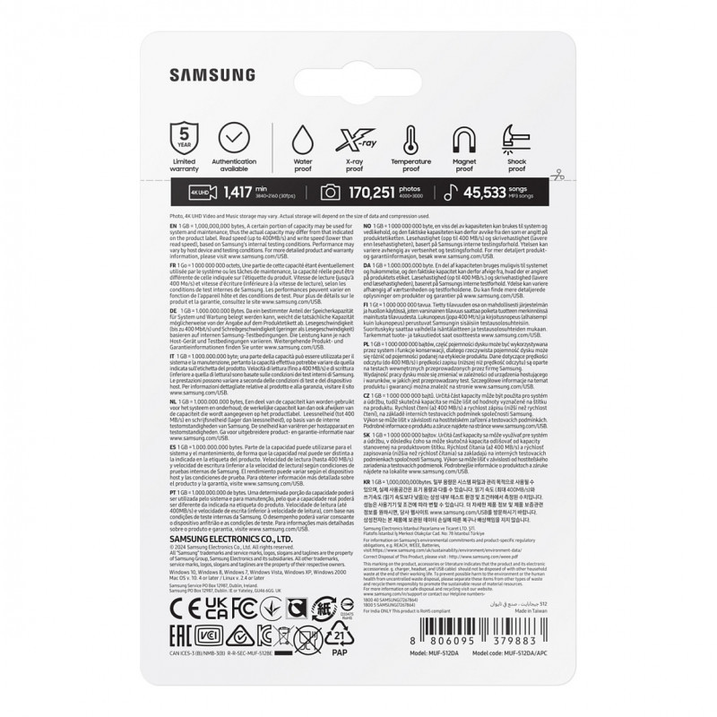"Samsung MUF-512DA. Capacity: 512 GB, Device interface: USB Type-C, USB version: 3.2 Gen 1 (3.1 Gen 1), Read speed: 400 MB/s. Form factor: Cap. Weight: 3.4 g. Product colour: Blue"\n"USB-C storage on the go