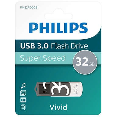 "Philips FM32FD00B. Capacity: 32 GB, Device interface: USB Type-A, USB version: 3.2 Gen 1 (3.1 Gen 1). Form factor: Swivel. Weight: 8 g. Product colour: Black, White"\n"Fast data transfer with super speed USB 3.0