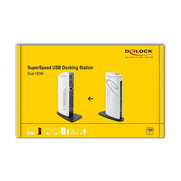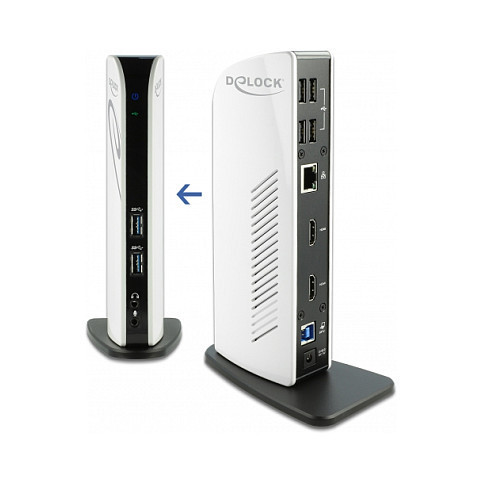 "DeLOCK USB Docking Station Dual HDMI Full-HD / USB 3.2 / LAN / Audio. Connectivity technology: Wired, Headphone connectivity: 3.5 mm. Ethernet LAN data rates: 10,100,1000 Mbit/s. Product colour: Black, White, Maximum digital resolution: 2560 x 1440 pixels. AC input voltage: 100 - 240 V, AC input frequency: 50 - 60 Hz, Input current: 0.8 A. Width: 38 mm, Depth: 78 mm, Height: 190 mm"\n"This docking station by Delock can be connected to a computer with a USB-C™ or USB Type-A port and provides a variety of interfaces. Two monitors can be operated simultaneously at the HDMI output ports. Four built-in USB 2.0 ports and two USB 3.2 Gen 1 ports allow the use of peripherals, and connections for microphone and speaker and Gigabit network complete the features.