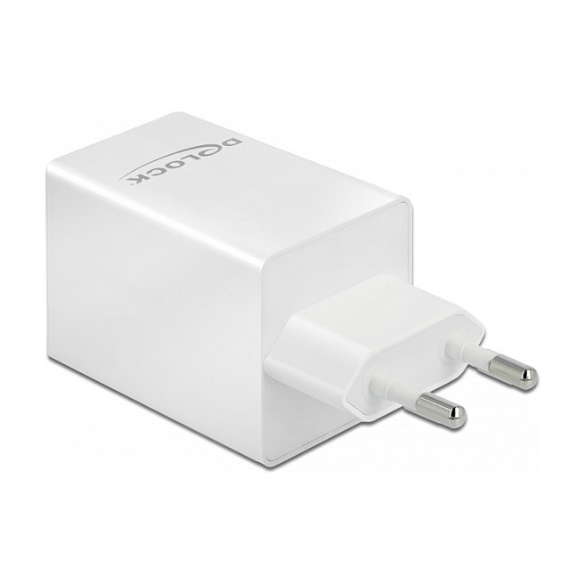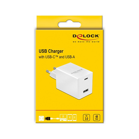"DeLOCK USB GaN Charger USB Type-C PD 3.0 and USB Type-A with 48 W. Charger type: Indoor, Power source type: AC, Charger compatibility: Universal. Input voltage: 100 - 240 V, Maximum output voltage: 20 V. USB 2.0 ports quantity: 1, USB Type-C ports quantity: 1, Power protection features: Over current, Overheating, Overload, Short circuit. Product colour: White"\n"This USB charger by Delock can be used to charge two USB devices. One port is equipped with a USB Type-C Power Delivery (PD), thereby supported devices can be charged with up to 45 watt. In addition, one USB Type-A port with fast charging technology up to 18 watt is available for smartphones.