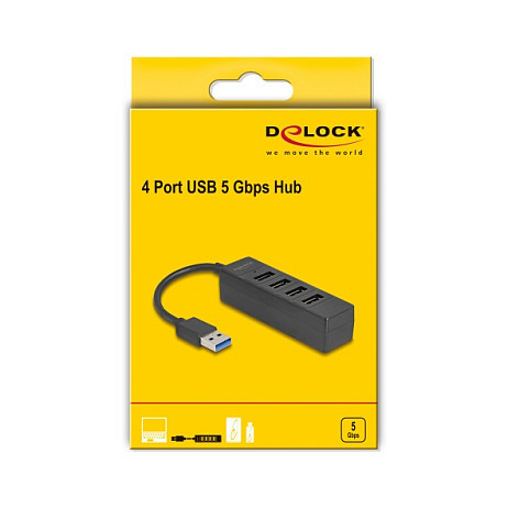 "DeLOCK 64350. Host interface: USB 3.2 Gen 1 (3.1 Gen 1) Type-A, Hub interfaces: USB 3.2 Gen 1 (3.1 Gen 1) Type-A. Data transfer rate: 5000 Mbit/s, Product colour: Black, Housing material: Acrylonitrile butadiene styrene (ABS). Output voltage: 5 V, Output current: 0.9 A. Windows operating systems supported: Windows 10, Windows 11, Mac operating systems supported: Mac OS 12.4, Yes, Linux operating systems supported: Linux Kernel 5.15, Yes. Width: 24 mm, Depth: 84 mm, Height: 20 mm"\n"The USB hub by Delock can be connected via USB Type-A interface to a PC or laptop. It has four USB Type-A connectors. Different USB devices such as USB flash memory, card reader, external enclosure etc. can be connected.