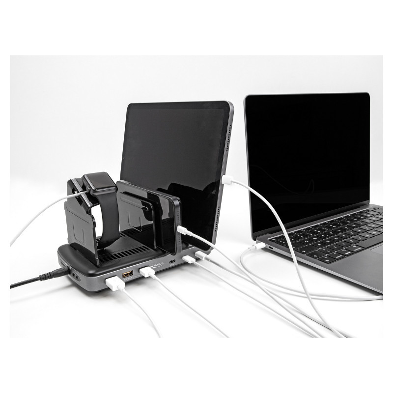 In addition to the holders for tablets and smartphones, the charging station also has the option of a smartwatch holder."