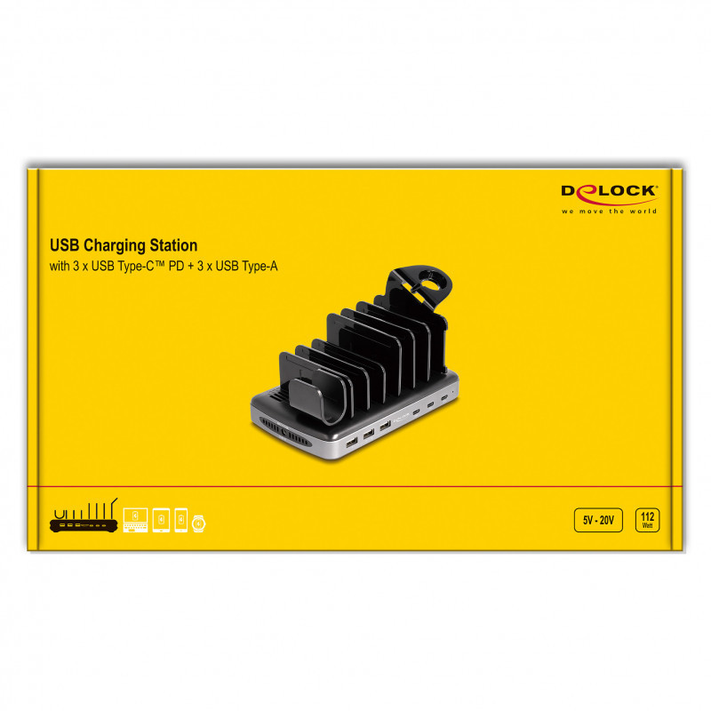 "DeLOCK USB Charging Station with 3 x USB Type-C PD + 3 x USB Type-A (112 W). Type: Freestanding, Material: Plastic, Product colour: Black, Grey. AC input voltage: 100 - 240 V, AC input frequency: 50/60 Hz, Maximum power: 112 W. Width: 113 mm, Depth: 185 mm, Height: 35 mm. Package type: Box. Cables included: AC, Quantity per pack: 1 pc(s)"\n"This USB Power Delivery (PD) charger by Delock can be used to charge devices like laptops with USB Type-C™ connector. It provides various voltages from 5 V to 20 V and power up to 60 watt. In addition, three USB Type-A connectorswith fast charging technology are available for smartphones. A total of up to 6 devices can be charged simultaneously.