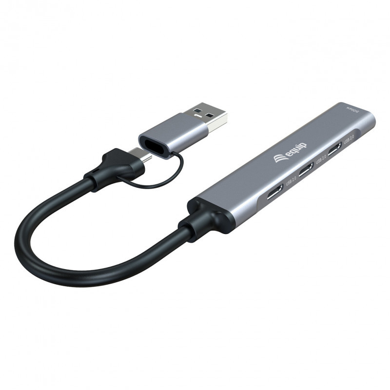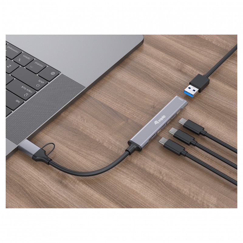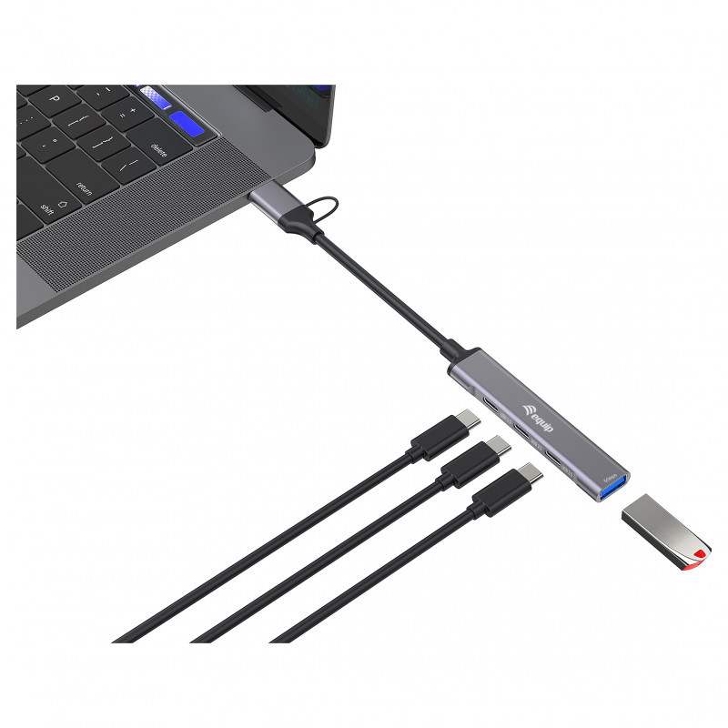 "Equip 4-Port USB 3.2 Gen 1/2.0 Hub, USB-C x 3 + USB-A x 1. Host interface: USB 3.2 Gen 1 (3.1 Gen 1) Type-C, Hub interfaces: USB 3.2 Gen 1 (3.1 Gen 1) Type-A, USB 3.2 Gen 1 (3.1 Gen 1) Type-C. Data transfer rate: 5000 Mbit/s, Product colour: Grey, Housing material: Aluminium. Power supply type: USB. Windows operating systems supported: Windows 10, Windows 10 Education, Windows 10 Education x64, Windows 10 Enterprise, Windows 10..., Mac operating systems supported: Mac OS X 10.10 Yosemite, Mac OS X 10.11 El Capitan, Mac OS X 10.12 Sierra, Mac OS X 10.13 High.... Width: 83 mm, Depth: 17.5 mm, Height: 7.5 mm"\n"The Equip 128969 4-Port USB 3.2 Gen 1/2.0 Hub is a practical and efficient solution for expanding the connectivity of laptops, tablets, and other USB-C enabled devices. Designed with a slim and lightweight profile, it provides users with three USB-C ports and one USB-A port in a single compact hub, making it an ideal companion for work, travel, or home office setups.