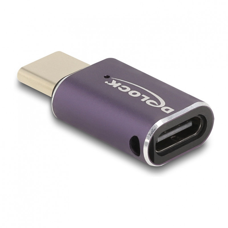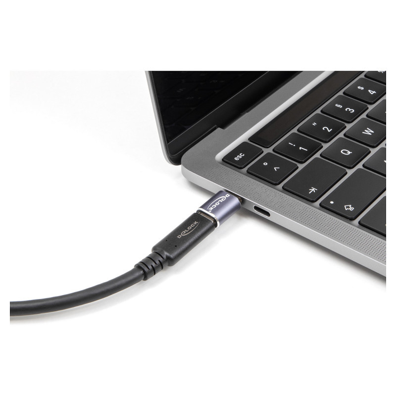 "DeLOCK USB Adapter 40 Gbps USB Type-C PD 3.1 240 W male to female port saver 8K 60 Hz metal. Connector 1: USB-C, Connector 2: USB-C. Product colour: Anthracite"\n"This USB-C™ adapter by Delock can be used for the connection of USB-C™ devices. It can be also connected to a free USB-C™ port in order to prevent the interface from damage when it is under usage for high contact durability."
