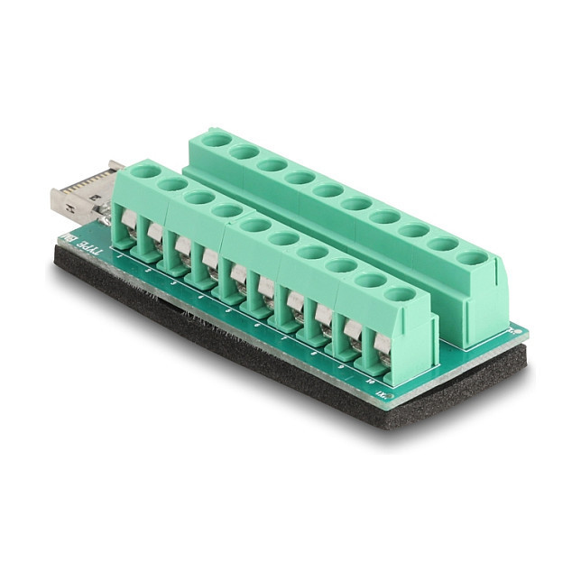 "DeLOCK USB Type-E Key A male to Terminal Block Adapter 20 pin. Connector 1: USB Type-E Key A, Connector 2: 20 pin terminal block. Product colour: Green"\n"With this terminal block adapter by Delock, stranded wires with stripped ends can be connected without tools. The adapter can be used for test purposes and industrial applications.