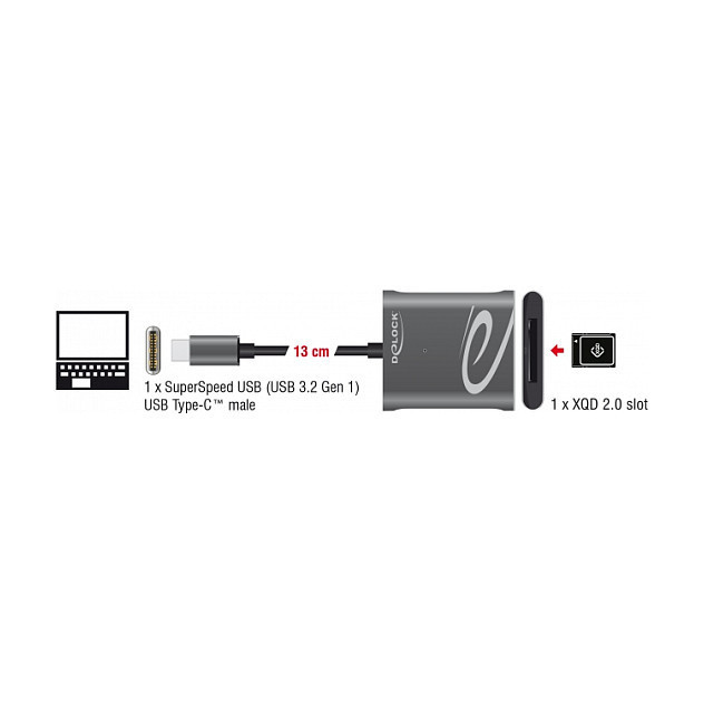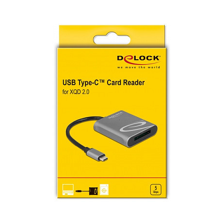"DeLOCK USB Type-C Card Reader for XQD 2.0 memory cards. Compatible memory cards: XQD, Product colour: Black, Grey, Data transfer rate: 5000 Mbit/s. Interface: USB 3.2 Gen 1 (3.1 Gen 1) Type-C. Width: 57 mm, Depth: 62 mm, Height: 15 mm"\n"The card reader by Delock can be used for reading and writing XQD memory cards. The card reader can be connected to a PC or laptop via the USB Type-C interface."