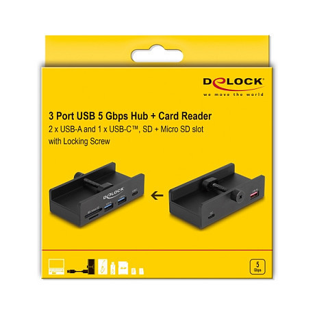 "DeLOCK 64263. Host interface: USB 2.0 Type-A, Hub interfaces: USB 3.2 Gen 2 (3.1 Gen 2) Type-A, USB 3.2 Gen 2 (3.1 Gen 2) Type-C, Compatible memory cards: MicroSD (TransFlash), SD. Data transfer rate: 5000 Mbit/s, Product colour: Black, Housing material: Aluminium, Plastic. Power supply type: USB, Output voltage: 5 V, Output current: 3 A. Width: 46 mm, Depth: 92 mm, Height: 23 mm. Quantity per pack: 1 pc(s), Package type: Box"\n"This USB hub by Delock can be connected to a computer via the USB Type-A interface. It expands the computer by two USB Type-A and one USB Type-C™ ports.