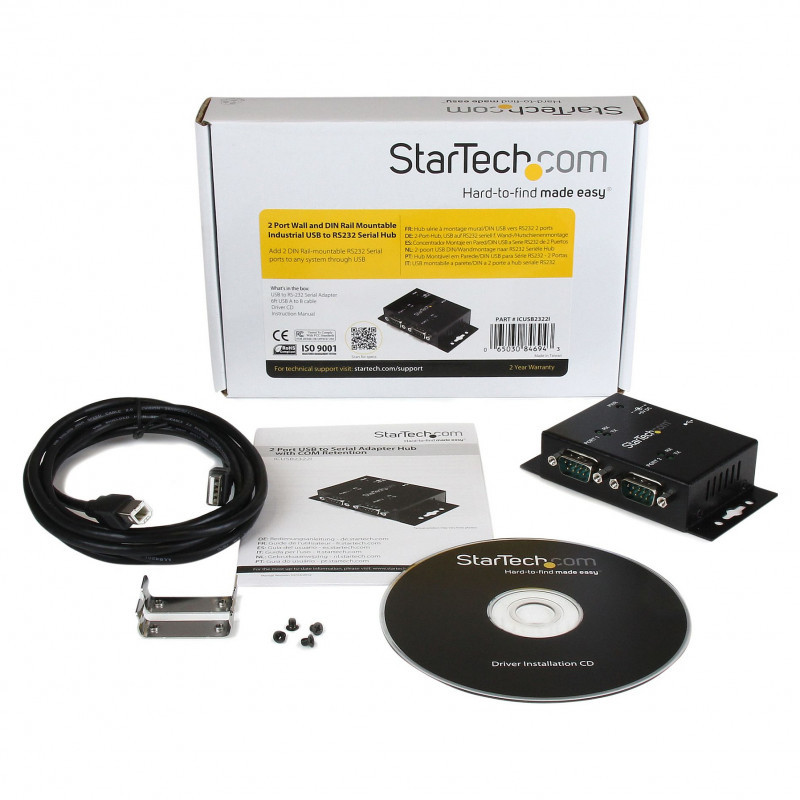 "StarTech.com 2 Port Industrial Wall Mountable USB to Serial Adapter Hub with DIN Rail Clips. Host interface: USB 2.0 Type-B, Hub interfaces: Serial. Product colour: Black, Housing material: Steel, LED indicators: Activity. Windows operating systems supported: Windows 2000, Windows 2000 Professional, Windows 7, Windows 7 Enterprise, Windows 7 Enterprise..., Mac operating systems supported: Mac OS X 10.10 Yosemite, Mac OS X 10.11 El Capitan, Mac OS X 10.12 Sierra, Mac OS X 10.13 High..., Other operating systems supported: Windows XP Embedded. Width: 66 mm, Depth: 104 mm, Height: 24 mm. Quantity per pack: 1 pc(s), Package width: 145 mm, Package depth: 214 mm"\n"Add 2 DIN Rail-mountable RS232 Serial ports to any system through USB