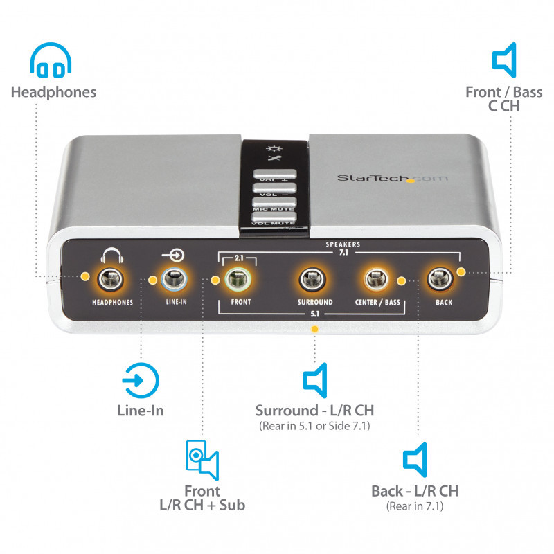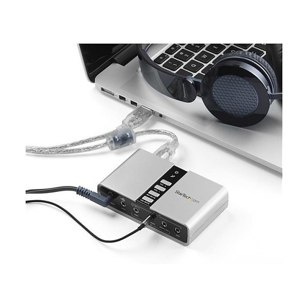 Providing a robust USB audio experience, the USB sound card connects to a host computer through a single USB 2.0 connection, to deliver impressive external audio capability that can instantly be swapped between systems, without having to open the computer case for installation.