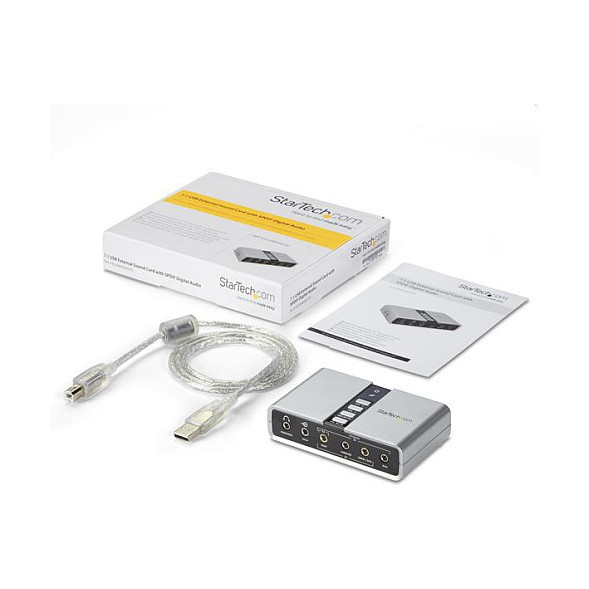 "StarTech.com 7.1 USB Audio Adapter External Sound Card with SPDIF Digital Audio. Audio output channels: 7.1 channels, Audio quality: 16 bit, Digital-to-Analog Conversion (DAC): 16-bit/48kHz. Host interface: USB. LED indicators: Activity, Power, Chipset: C-Media CM6206, Certification: RoHS, CE, FCC, REACH. Windows operating systems supported: Windows 10, Windows 10 Education, Windows 10 Education x64, Windows 10 Enterprise, Windows 10.... Weight: 90 g, Width: 60 mm, Depth: 100 mm"\n"This versatile External USB Sound Card/Audio Adapter offers a high quality solution for upgrading desktop or laptop sound.