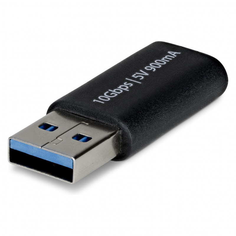 "StarTech.com USB-A to USB-C Adapter, USB-A Male to USB-C Female Converter, USB 10Gbps, 5V 900mA, USB to USB C Adapter for USB-A Chargers/Hubs. Connector 1: USB-A, Connector 2: USB-C, Connector contacts plating: Nickel. Product colour: Black"\n"Connect your USB-C peripherals to a USB-A laptop, hub, or charger