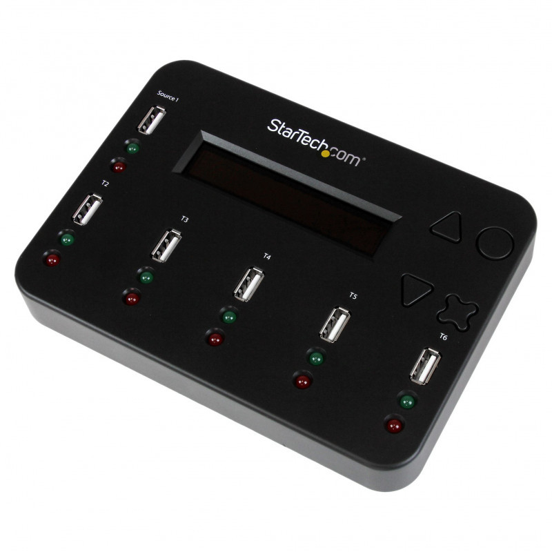 "StarTech.com Standalone 1 to 7 USB Thumb Drive Duplicator and Eraser, Multiple USB Flash Drive Copier, System and File and Whole-Drive Copy at 1.5 GB/min, Single and 3-Pass Erase, LCD Display - TAA. Product type: USB flash drive duplicator, Number of simultaneous copies: 7 copies, Interface: USB 2.0. Power consumption (typical): 108 W, AC input voltage: 100 - 240 V, Input current: 1.6 A. Dimensions (WxDxH): 160 x 190 x 35 mm, Weight: 1.1 kg. Package width: 235 mm, Package depth: 445 mm, Package height: 85 mm. Master (outer) case length: 480 mm, Master (outer) case width: 470 mm, Master (outer) case height: 285 mm"\n"Standalone 1 to 7 USB Thumb Drive Duplicator & Eraser, Flash Drive Copier