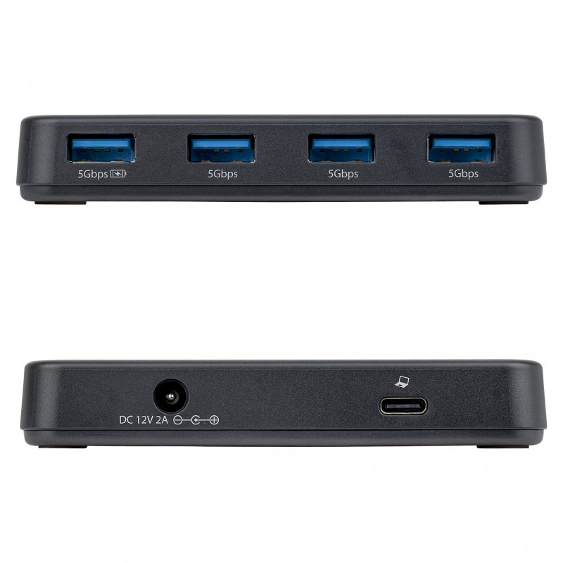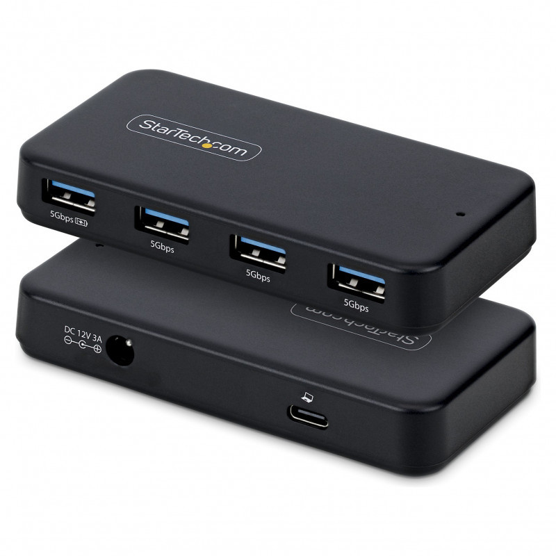 "StarTech.com 4-Port USB-A Hub, 5Gbps, Self-Powered, 2-in-1 USB-C and USB-A Host Cable, 1x BC 1.2 Charging Port, 24W Power Adapter Included, MacBook and Windows. Host interface: USB 3.2 Gen 1 (3.1 Gen 1) Type-C, Hub interfaces: USB 3.2 Gen 1 (3.1 Gen 1) Type-A. Data transfer rate: 5000 Mbit/s, Product colour: Black, Housing material: Plastic. Power consumption (typical): 24 W, Input voltage: 1 V, Input current: 0.7 A. Width: 52 mm, Depth: 101 mm, Height: 16.5 mm. Quantity per pack: 1 pc(s), Package width: 200 mm, Package depth: 147 mm"\n"Add four 5Gbps USB-A ports (one with BC 1.2) to your laptop or PC using a single USB-C or USB-A connection