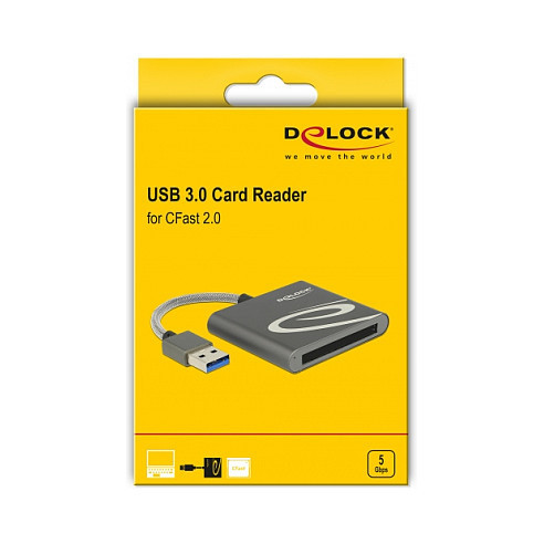 "DeLOCK 91525. Compatible memory cards: XQD, Product colour: Grey, Data transfer rate: 480 Mbit/s. Interface: USB 3.2 Gen 1 (3.1 Gen 1). Width: 50.7 mm, Depth: 58.1 mm, Height: 10.3 mm. Quantity per pack: 1 pc(s), Package type: Box. Compatible operating systems: • Mac OS 10.9 or above • Windows 7 32-bit • Windows 7 64-bit • Windows 8.1 32-bit •..."\n"The card reader by Delock can be used for reading and writing CFast memory cards. The card reader can be connected to a PC or laptop via the USB Type-A interface."