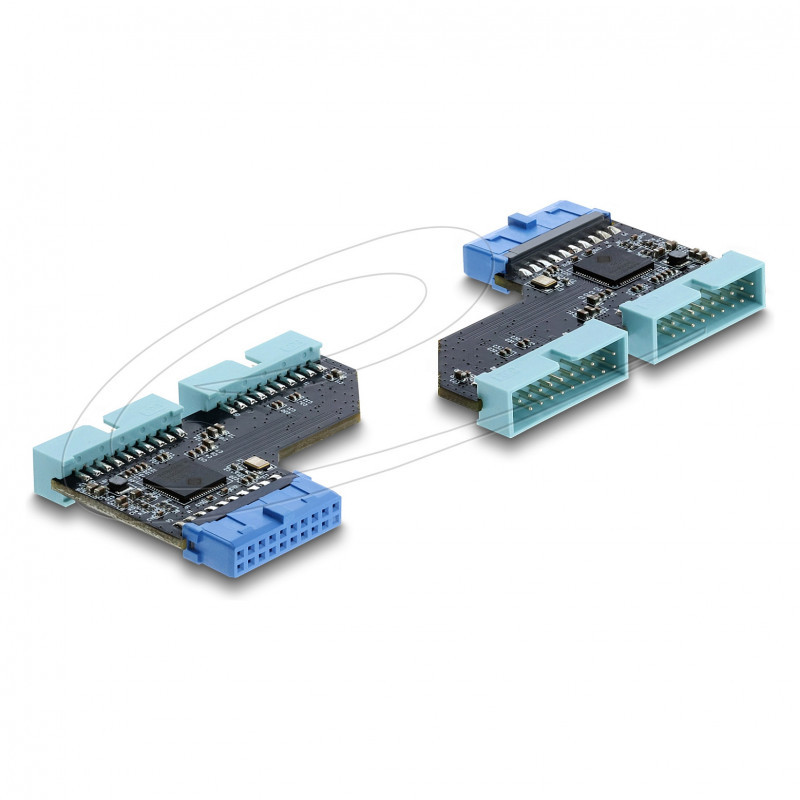 "DeLOCK 67341. Connector 1: USB 5 Gbps 20 pin header, Connector 2: 2x USB 5 Gbps 20 pin header. Product colour: Black, Blue"\n"This USB hub by Delock allows to split an internal USB 5 Gbps pin header into two separate 20 pin connectors. Ideal for PC cases, motherboards or expansion cards where multiple USB front connectors need to be connected to a single internal USB header.
