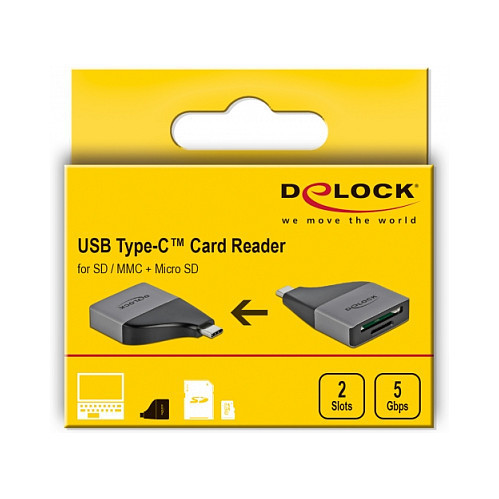 "DeLOCK USB Type-C Card Reader for SD / MMC + Micro SD memory cards – compact design. Compatible memory cards: MMC, MMC Mobile, MMCmicro, MicroSD (TransFlash), MicroSDHC, MiniSD, MiniSDHC, RS-MMC, SD, SDHC, SDXC, Product colour: Grey, Data transfer rate: 5000 Mbit/s. Interface: USB 3.2 Gen 1 (3.1 Gen 1) Type-C. Width: 35 mm, Depth: 51 mm, Height: 10 mm"\n"This card reader by Delock has two memory card slots and allows to read and write different SD, MMC and Micro SD memory cards. The card reader can be connected to a PC or a mobile device via the USB Type-C interface.
