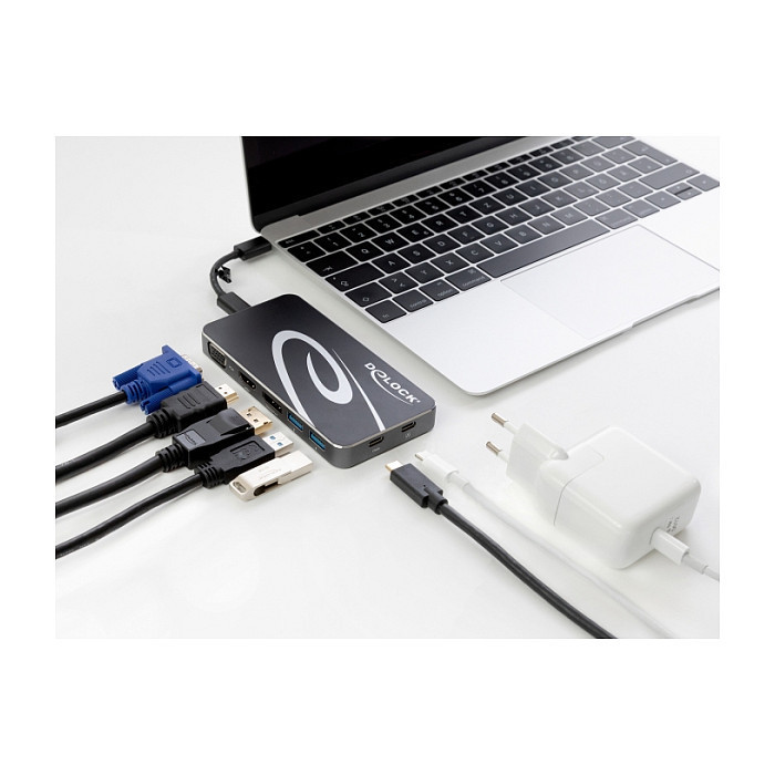 "DeLOCK USB Type-C 3.2 Dockingstation 4K HDMI DP / 1080p VGA, USB Hub und PD 3.0. Connectivity technology: Wired, Host interface: USB 3.2 Gen 1 (3.1 Gen 1) Type-C, USB Power Delivery up to: 4.5 W. Product colour: Black, Maximum digital resolution: 3840 x 2160 pixels, Country of origin: China. Windows operating systems supported: Windows 10, Windows 10 x64, Windows 8.1, Windows 8.1 x64, Mac operating systems supported: Mac OS X 10.15.3 Catalina, Mobile operating systems supported: Android 9.0. Width: 63 mm, Depth: 127 mm, Height: 14 mm. Cables included: USB Type-C to USB Type-C"\n"This docking station by Delock can be connected to a computer with a USB-C Alt-Mode or Thunderbolt 3 port and provides a variety of interfaces. Three monitors can be operated simultaneously at the DisplayPort, HDMI and VGA outputs. Two built-in USB Type-A ports and one USB Type-C port allows the use of peripherals.
