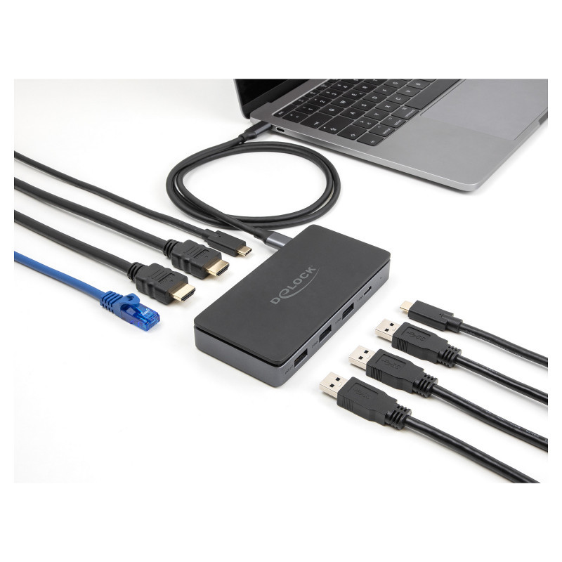 "DeLOCK USB Type-C Docking Station 4K - Dual HDMI MST / USB / Gibabit LAN / PD 3.0 85 W. Connectivity technology: Wired, Host interface: USB 3.2 Gen 1 (3.1 Gen 1) Type-C, USB Power Delivery up to: 85 W. Ethernet LAN data rates: 10,100,1000 Mbit/s. Product colour: Black, Grey, Data transfer rate: 5 Gbit/s, HD type: 4K Ultra HD. Power source type: USB, Power connector: USB Type-C, USB cable length: 1 m. Windows operating systems supported: Windows 10, Windows 11, Mac operating systems supported: Mac OS X 14.0 Sonoma, Linux operating systems supported: Linux Kernel 5.15, Linux Kernel 5.19, Linux Kernel 5.4, Linux Kernel 5.8, Linux Kernel 5.9, Linux..."\n"This docking station by Delock can be connected to a computer with a USB-C™ DP Alt Mode or Thunderbolt™ 3 or Thunderbolt™ 4 port and provides a variety of interfaces. Two monitors can be operated simultaneously at the HDMI output ports. Three built-in USB Type-A and one USB-C™ port allow the use of peripherals.