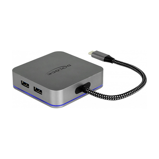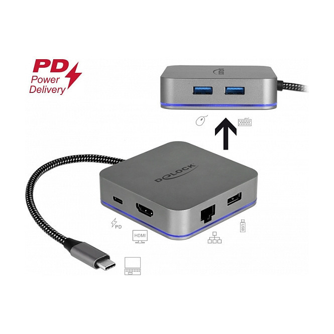 "DeLOCK 87742. Basic device type: Tablet, Brand compatibility: Any brand. Docking connector type: USB. Width: 75 mm, Depth: 75 mm, Height: 19 mm. Product colour: Grey"\n"This docking station by Delock can be connected to a mobile device with a USB-C™ DP Alt Mode or Thunderbolt™ 3 port and provides a variety of interfaces. One monitor can be operated at the HDMI output. Three built-in USB ports allow the use of peripherals. The gigabit network port enables the connection to the network.