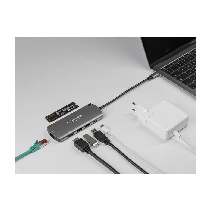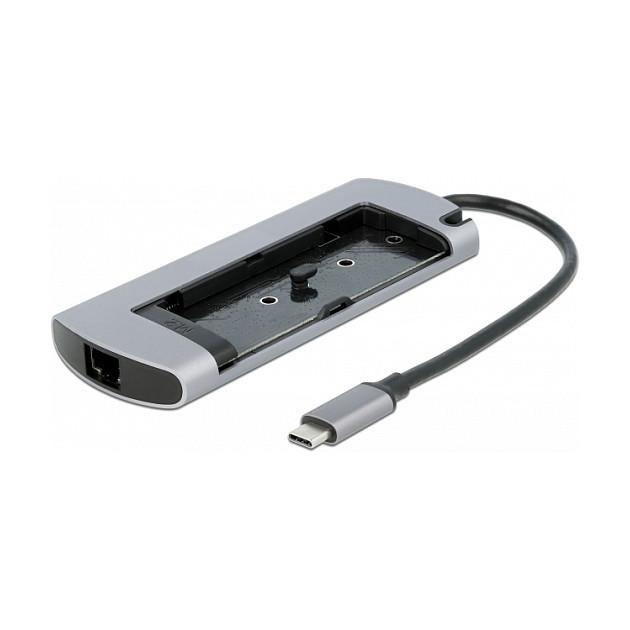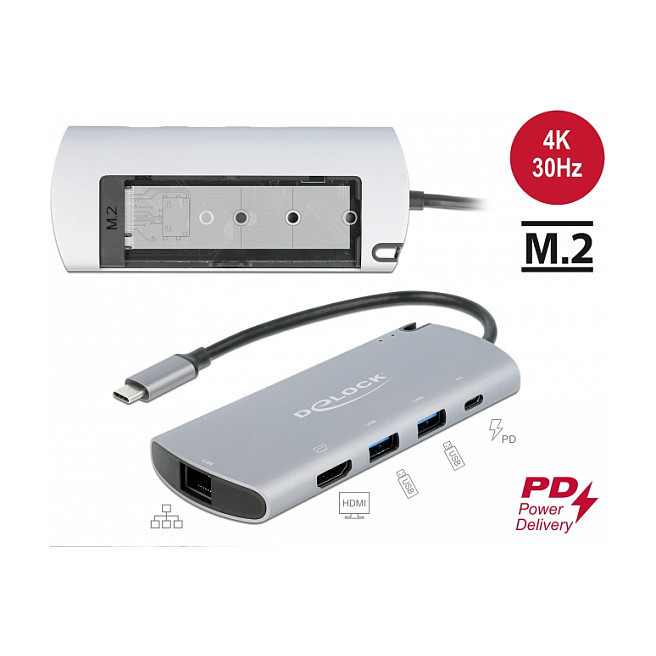 "DeLOCK USB Type-C Docking Station with M.2 Slot - 4K HDMI / USB / LAN / PD 3.0. Connectivity technology: Wired, Host interface: USB 3.2 Gen 1 (3.1 Gen 1) Type-C, USB Power Delivery up to: 100 W. Ethernet LAN data rates: 10,100,1000 Mbit/s. Product colour: Grey, Supported storage drive types: SSD, Storage drive sizes supported: M.2. Power source type: USB, Power connector: USB Type-C. Windows operating systems supported: Windows 10, Windows 10 x64, Windows 8.1, Windows 8.1 x64, Mac operating systems supported: Mac OS X 10.15.3 Catalina, Mobile operating systems supported: Android 9.0, iPadOS"\n"This docking station by Delock can be connected to a computer with a USB-C DP Alt Mode or Thunderbolt 3 port and provides a variety of interfaces. A monitor can be operated at the HDMI output. Two built-in USB 3.2 Gen 1 ports allow the use of peripherals and a connector for gigabit network completes the features.
