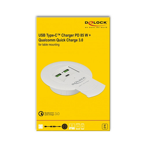 "DeLOCK 64065. Charger type: Indoor, Power source type: DC, Charger compatibility: Smartphone. Input voltage: 100 - 240 V, Maximum output voltage: 12 V. USB 2.0 ports quantity: 2, USB Type-C ports quantity: 1, Fast charging. Product colour: White"\n"This USB Power Delivery (PD) charger by Delock can be used to charge laptops with USB Type-C™ connector. It provides various voltages from 5 V to 20 V and power up to 85 Watt. In addition, 2 USB Type-A connectors with Qualcomm Quick Charge 3.0 charging technology are available for smartphones.