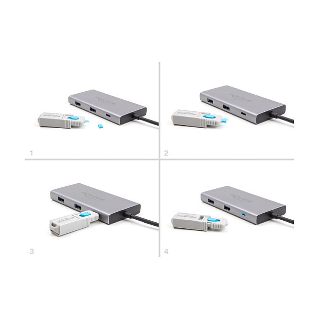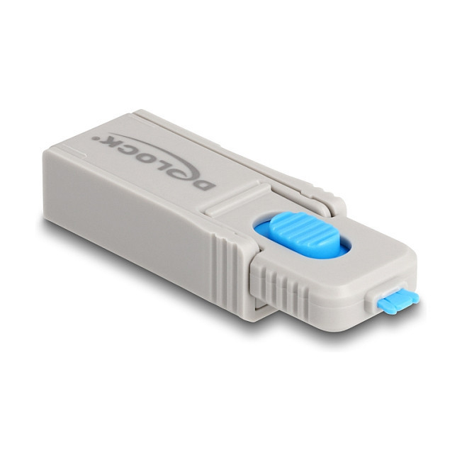 "DeLOCK USB Type-C Port Blocker Set for USB Type-C female ports 5 pieces + lock tool. Product type: Port blocker + key, Compatible ports/slots: USB Type-C, Product colour: Blue, Grey. Width: 19 mm, Depth: 69 mm, Height: 12 mm"\n"Description