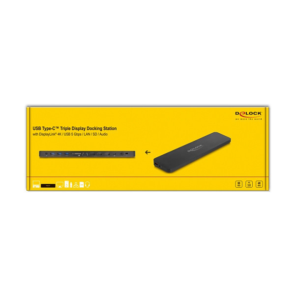 "DeLOCK USB Type-C Triple Display Docking Station with DisplayLink 4K / USB 5 Gbps / LAN / SD / Audio / PD 80 W. Connectivity technology: Docking, Host interface: PCIe, Headphone connectivity: 3.5 mm. Ethernet LAN data rates: 10,100,1000 Mbit/s. Product colour: Black, Compatible memory cards: MicroSD (TransFlash), SD. Width: 76 mm, Depth: 304 mm, Height: 19 mm. Quantity per pack: 1 pc(s)"\n"This docking station by Delock can be connected to a computer with a USB-C™ DP Alt Mode, Thunderbolt™ 3 or Thunderbolt™ 4 and provides a variety of interfaces. Three monitors can be operated at the monitor outputs at the same time. Five built-in USB 5 Gbps ports allow the use of peripherals and another USB port can be used to charge mobile devices. Connectors for a headset, a Gigabit network connection, as well as a card reader for SD and Micro SD memory cards complete the features. A safety cable can be attached to the Kensington socket to protect the docking station from theft.