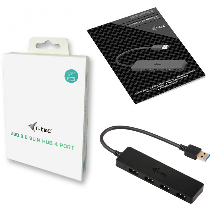 "i-tec Advance USB 3.0 Slim Passive HUB 4 Port. Host interface: USB 3.2 Gen 1 (3.1 Gen 1) Type-A, Hub interfaces: USB 3.2 Gen 1 (3.1 Gen 1) Type-A. Data transfer rate: 5000 Mbit/s, Product colour: Black, Cable length: 0.2 m. Power source type: USB. Width: 110 mm, Depth: 30 mm, Height: 10 mm. Package width: 210 mm, Package depth: 153 mm, Package height: 23 mm"\n"The ADVANCE Series is the highest level of i-tec accessories bringing you the cutting edge technologies of products with a modern design and exclusive packaging.