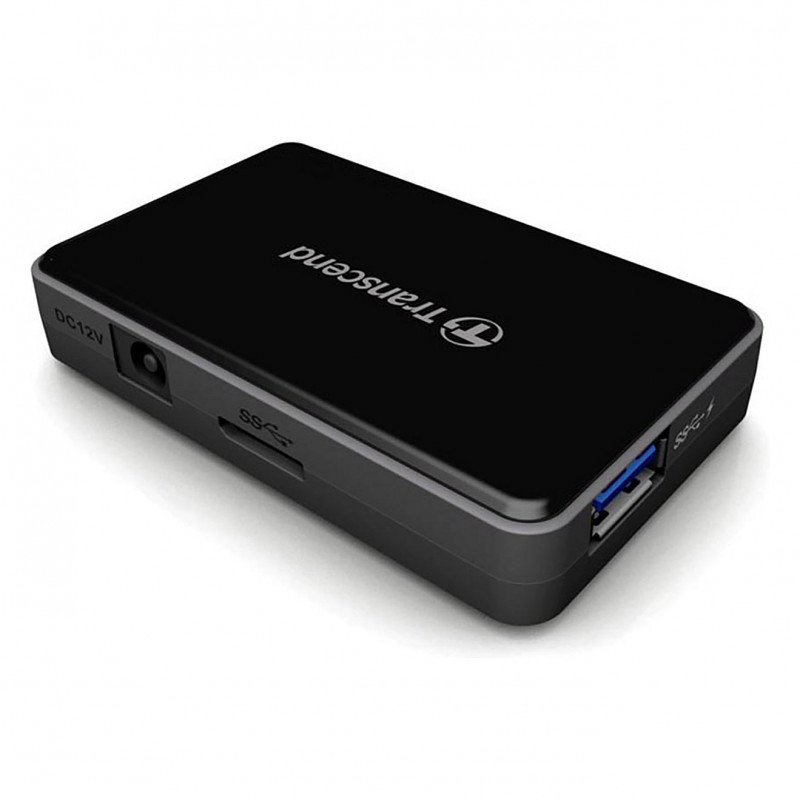 "Transcend HUB3. Hub interfaces: USB 3.2 Gen 1 (3.1 Gen 1) Type-A. Product colour: Black, Certification: CE/FCC/BSMI/KC/RCM/EAC. Input voltage: 5 - 12 V. Windows operating systems supported: Windows 10, Windows 7, Windows 8, Mac operating systems supported: Mac OS X 10.2 Jaguar, Linux operating systems supported: Kernel 2.6.31. Width: 49.5 mm, Depth: 15 mm, Height: 78.6 mm"\n"Ideal for use with Ultrabooks and thin-and-light laptops, Transcend's HUB3 transforms a single USB 3.1 Gen 1 port into four, instantly expanding the number of USB 3.1 Gen 1 devices you can connect to your computer at the same time. With the included power adapter, the HUB3 can supply high output currents of up to 2A via its dedicated fast charging port. This allows the Apple iPad to charge much quicker than using a standard USB port."