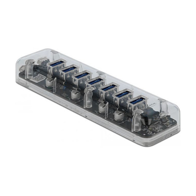 "DeLOCK External USB 3.0 Hub with 7 Ports transparent. Host interface: USB 3.2 Gen 1 (3.1 Gen 1) Micro-B, Hub interfaces: USB 3.2 Gen 1 (3.1 Gen 1) Type-A. Data transfer rate: 5000 Mbit/s, Product colour: Transparent. Width: 35 mm, Depth: 135 mm, Height: 19 mm"\n"This solid USB hub by Delock with can be connected to a computer via the USB Type-A interface. It expands the computer by 7 USB Type-A ports. Connected devices such as smartphones can be charged or data can be transferred at 5 Gbps.