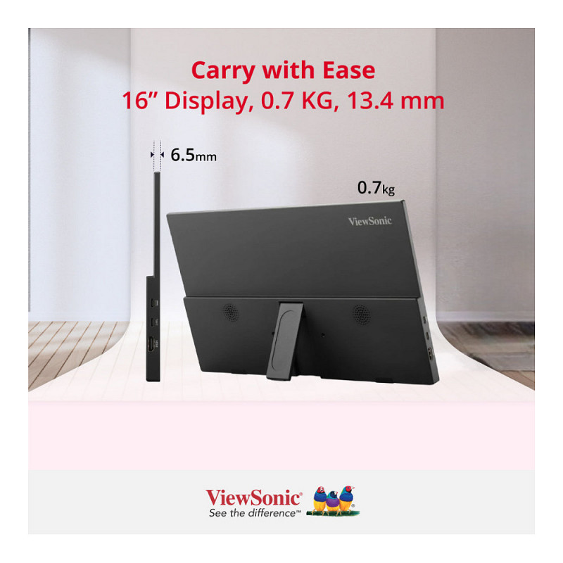 "Viewsonic VA1650. Display diagonal: 40.6 cm (16""), Display resolution: 1920 x 1080 pixels, HD type: Full HD, Display technology: LED, Response time: 7 ms, Native aspect ratio: 16:9, Viewing angle, horizontal: 178°, Viewing angle, vertical: 178°. Built-in speaker(s). Built-in USB hub, USB hub version: 3.2 Gen 1 (3.1 Gen 1). VESA mounting. Product colour: Black"\n"The ViewSonic VA1650 is a lightweight, portable 16” Full HD portable monitor with USB-C connectivity for power charging. Designed to boost productivity on the go, extend your screen from a phone, tablet, or laptop to a larger display anytime, anywhere. The included protective sleeve makes it effortless to safely carry and protect your monitor, whether traveling, relaxing outdoors, or simply moving around your home.