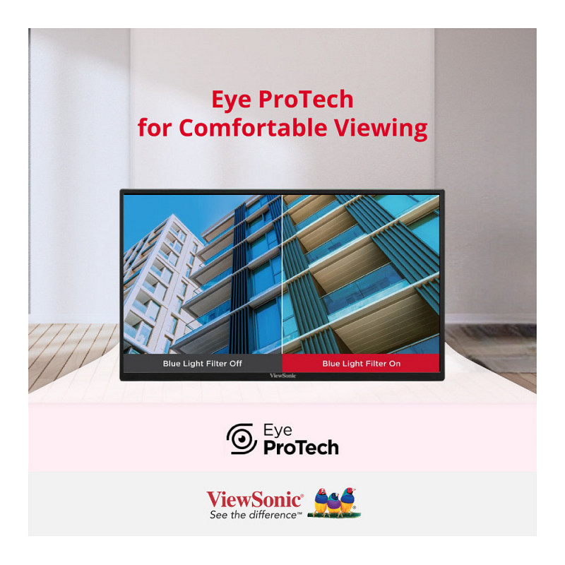 Reduce your eye strain and maintain fresh-feeling eyes with ViewSonic Eye ProTech. The Flicker-Free technology eliminates screen flickering, while the Blue Light Filter minimizes harmful blue light from extended viewing periods, ensuring comfortable screen viewing.