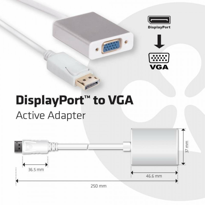 "CLUB3D Displayport to VGA Active Adapter. Connector 1: DisplayPort, Connector 2: VGA. Product colour: Black"\n"CAC-2003 - The Club 3D is an active DisplayPort™ to VGA signal converter. It enables you to connect your analog VGA Televisions, Monitors or Projectors to your Desktop or Laptop with DisplayPort™ output.