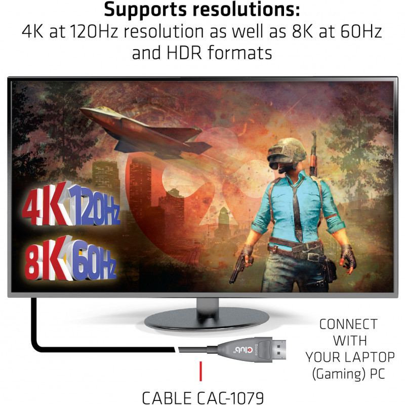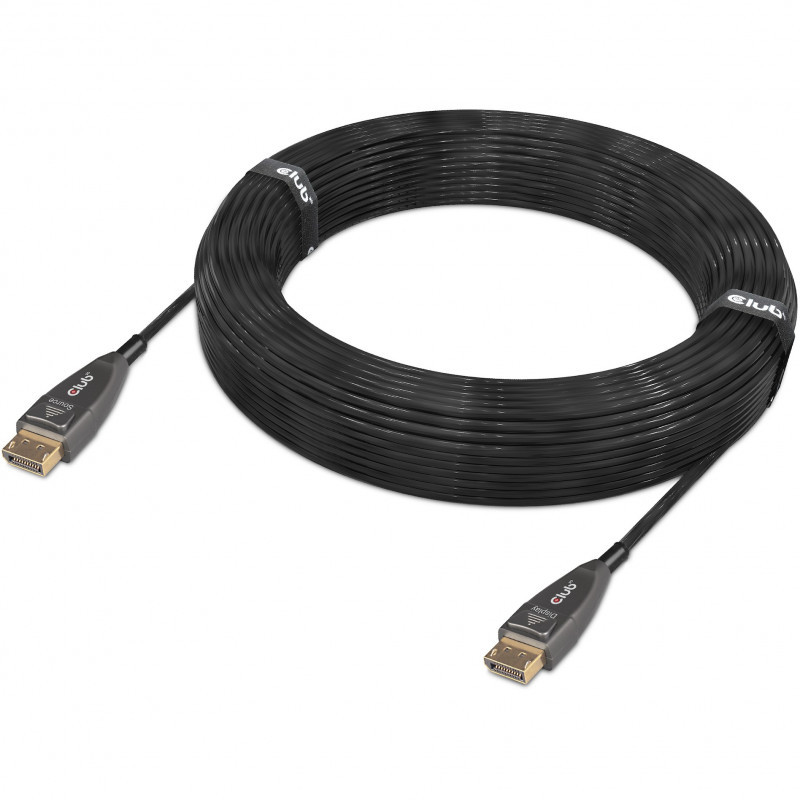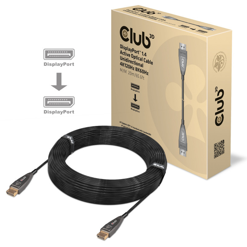 "CLUB3D DisplayPort 1.4 Active Optical Cable Unidirectional 4K120Hz 8K60Hz M/M 20m/65.62ft. Cable length: 20 m, Connector 1: DisplayPort, Connector 2: DisplayPort. Certification: ROHS, FCC, CE EMI. Weight: 665 g. Package width: 230 mm, Package depth: 50 mm, Package height: 230 mm"\n"The Club 3D CAC-1079 is an Active Optical Unidirectional DisplayPort™ Cable that allows support for 8.1Gbps per channel. It supports 4K at 120Hz resolution as well as 8K at 60Hz and HDR formats. This optical fiber cable can be applied to outdoor displays, LED signboards, home cinema displays, conference rooms, medical imaging equipment or security systems to transfer audio and video sig"