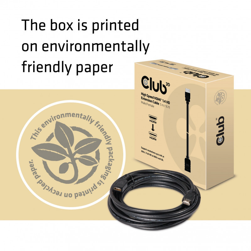 "CLUB3D High Speed HDMI™ 1.4 HD Extension Cable 5m/16ft Male/Female. Cable length: 5 m, Connector 1: HDMI Type A (Standard), Connector 1 gender: Male, Connector 2: HDMI Type A (Standard), Connector 2 gender: Female, Connector contacts plating: Gold, HDMI version: 2.0, 3D, Data transfer rate: 10.2 Gbit/s, Product colour: Black"\n"CAC-1320 - High Speed HDMI™ 1.4 HD Extension Cable