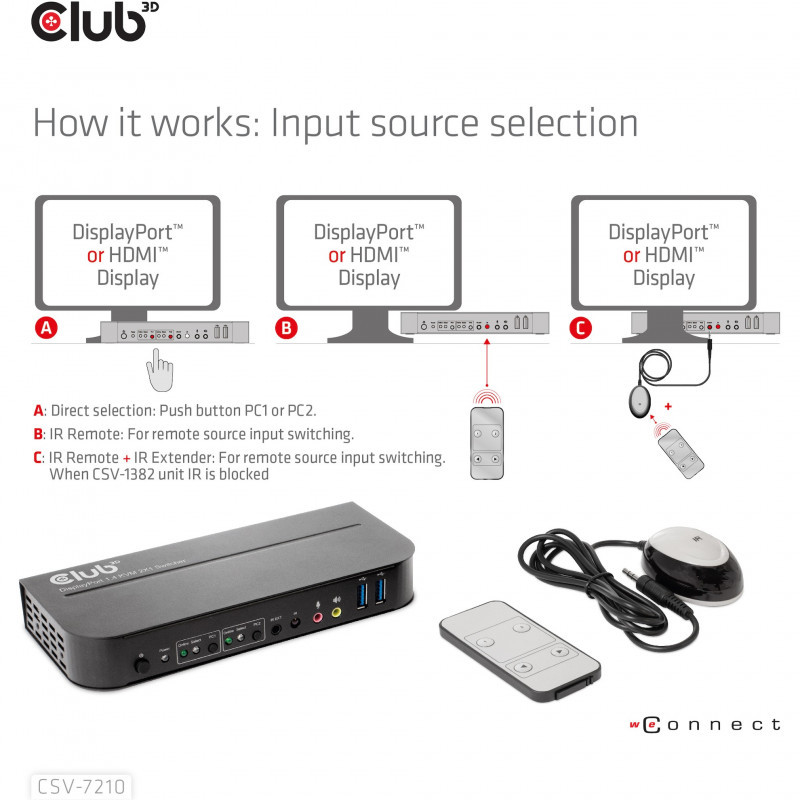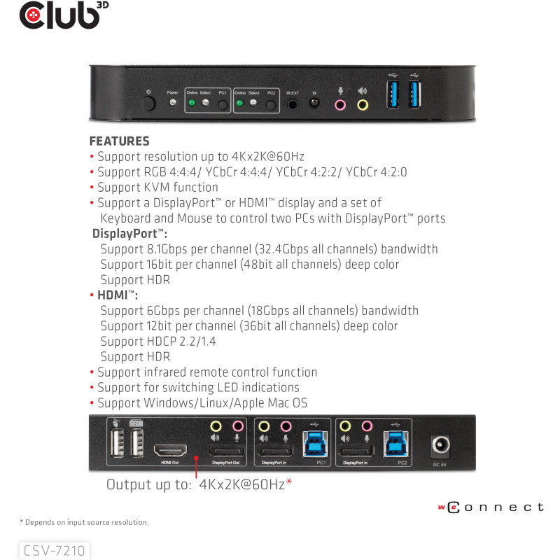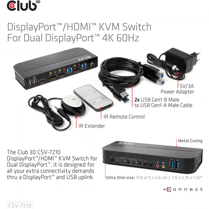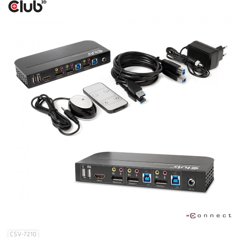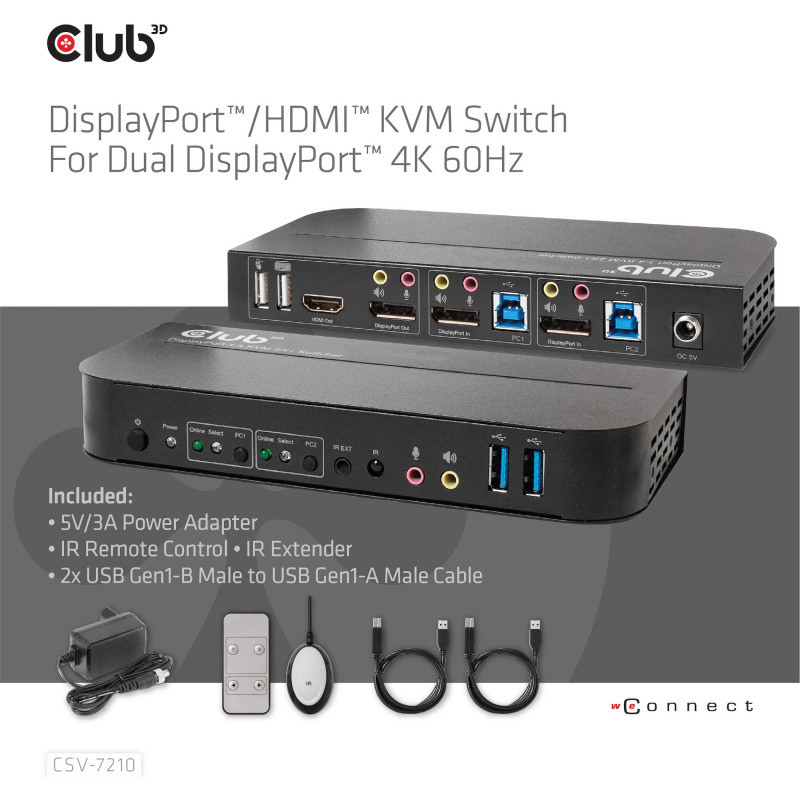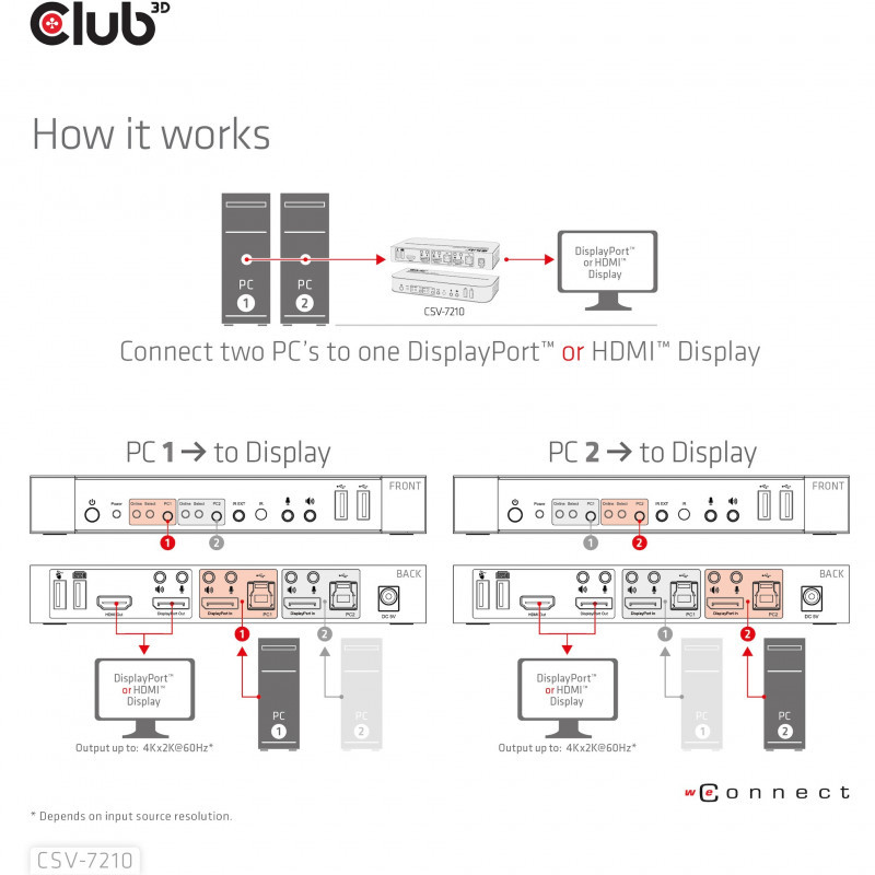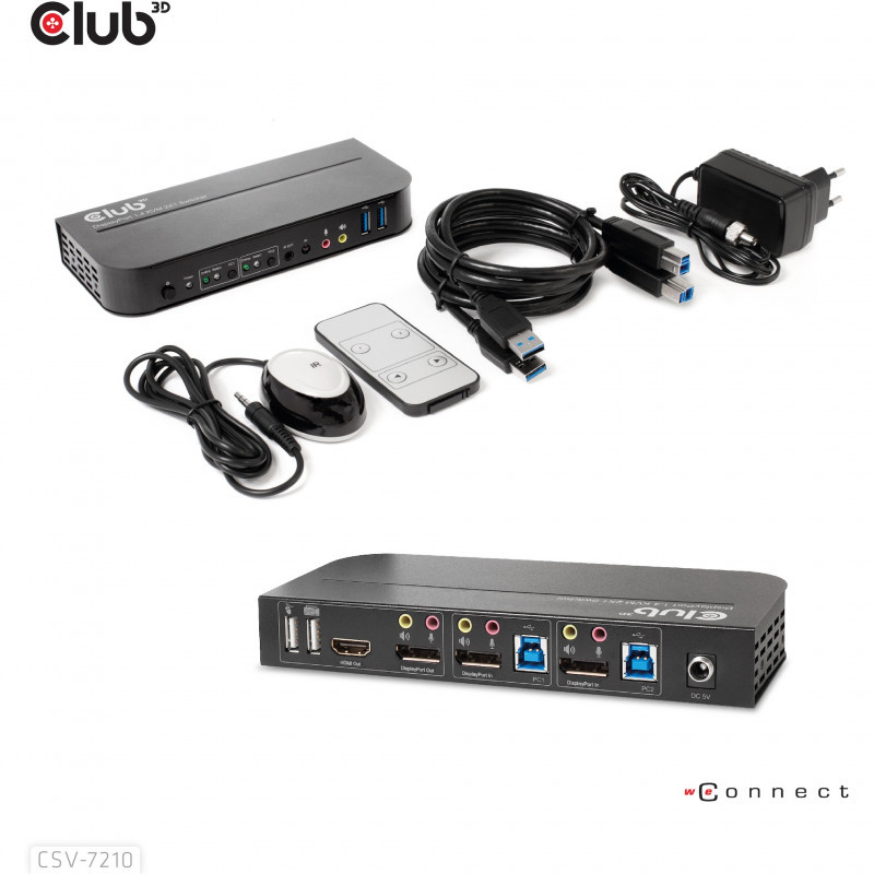 "CLUB3D DisplayPort/HDMI KVM Switch For Dual DisplayPort 4K 60Hz. Keyboard port type: USB, Mouse port type: USB, Video port type: HDMI/DisplayPort. HD type: 4K Ultra HD, Maximum resolution: 4096 x 2160 pixels, Video bandwidth: 60 Hz. Product colour: Black, Housing material: Metal. Power source: DC, Input voltage: 5 V, Power consumption (typical): 12 W. Width: 178 mm, Depth: 75 mm, Height: 26 mm"\n"The CSV-7210 is a high performance DisplayPort™ KVM (Keyboard Video and Mouse) switcher. It routes high definition videos up to 4096x2160 at 60Hz resolution and audio from any DisplayPort™ source to any HDMI™ or DisplayPort™ supported display. This DisplayPort™ KVM switcher not only has the key press switching function, but also has an intelligent function as well as hot pluggable function."