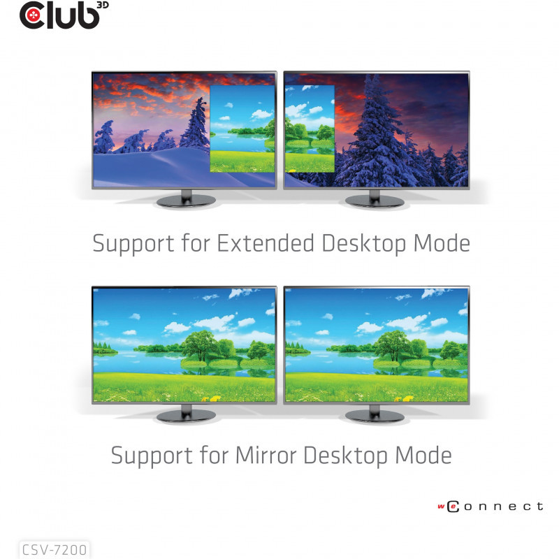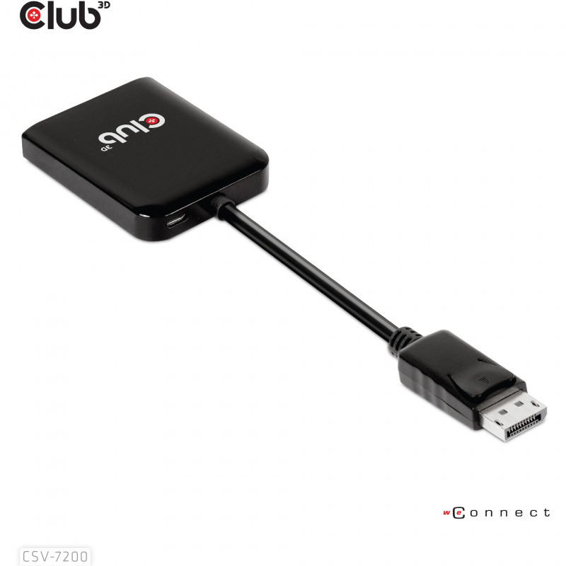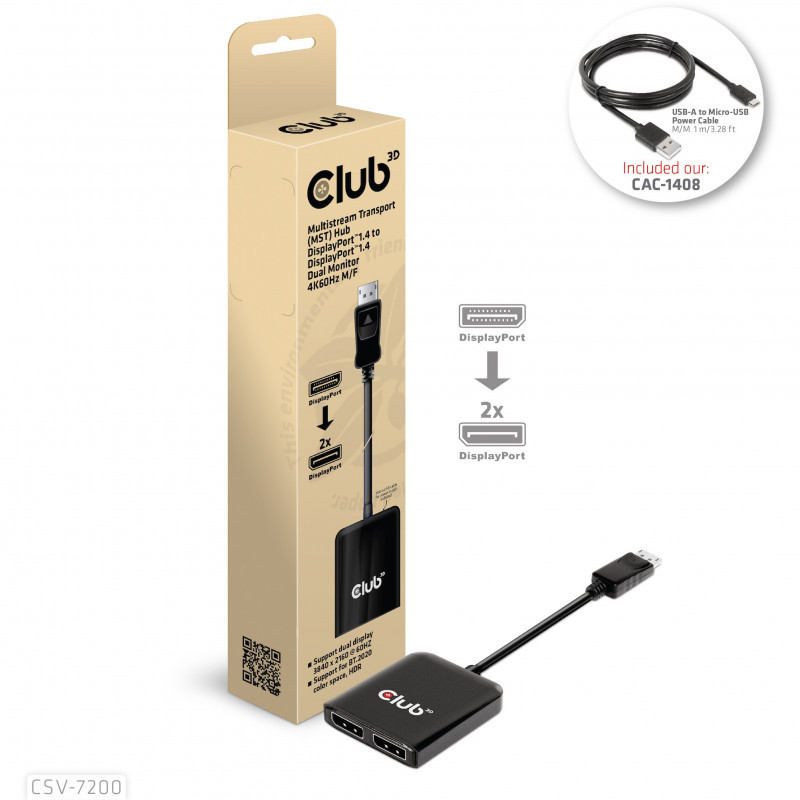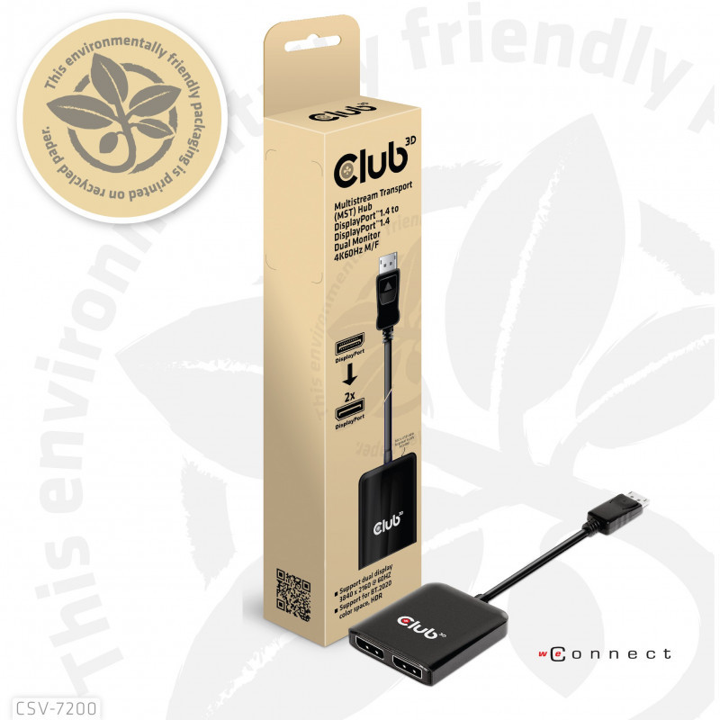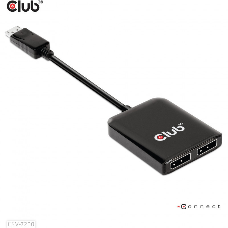 "CLUB3D Multistream Transport (MST) Hub DisplayPort™1.4 to DisplayPort™1.4 Dual Monitor 4K60Hz M/F. Video port type: DisplayPort, Video out: 2x DisplayPort. Maximum resolution: 3840 x 2160 pixels, Product colour: Black, HDCP version: 1.4/2.2. Width: 60 mm, Depth: 49 mm, Height: 11.3 mm. Quantity per pack: 1 pc(s), Package width: 60 mm, Package depth: 240 mm"\n"The Club 3D CSV-7200H Multi Stream Transport (MST) Hub DisplayPort™ 1.4 to Dual HDMI 4K60Hz is an integrated solution that allows you to enjoy displaying content onto two different displays simultaneously under MST mode. The Two screens can accommodate displaying the same contents in parallel or by simply extending the existing screen, giving a panoramic view of the content which maximizes the user’s visual experience. With its multi-display capabilities, this hub can serve as a convenient and hassle-free portable, alternative solution to the conventional docking station. It is the perfect solution for host devices that feature DP1.2 /1.4 graphic cards for gaming and commercial applications."