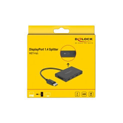 "DeLOCK DisplayPort 1.4 Splitter 1 x DisplayPort in to 4 x DisplayPort out. Video port type: DisplayPort, Video out: 4x DisplayPort. Maximum resolution: 7680 x 4320 pixels, Product colour: Black, Housing material: Plastic. Width: 66 mm, Depth: 105 mm, Height: 15 mm. Quantity per pack: 1 pc(s)"\n"Description