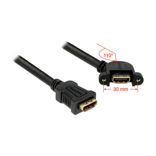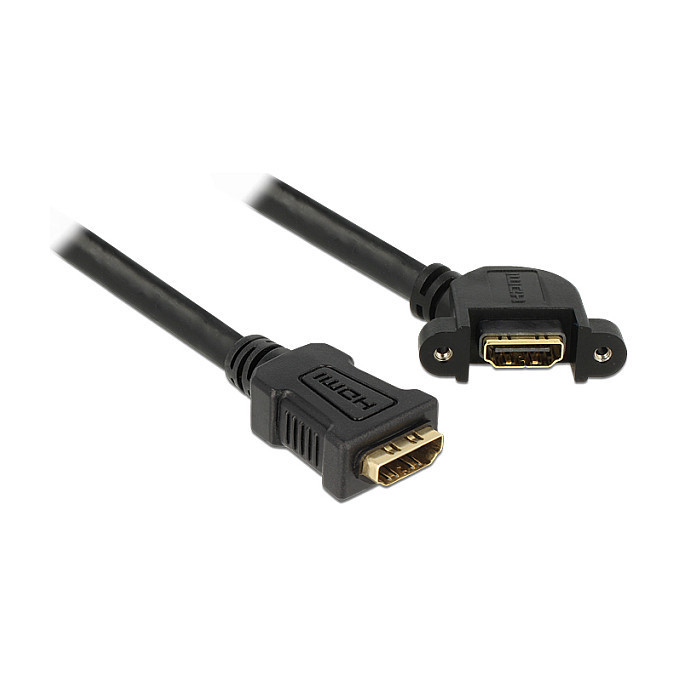 "DeLOCK 0.25m 2xHDMI. Cable length: 0.25 m, Connector 1: HDMI Type A (Standard), Connector 1 gender: Female, Connector 2: HDMI Type A (Standard), Connector 2 gender: Female, Connector contacts plating: Gold, Product colour: Black"\n"This cable enables you to extend a HDMI connection and can be used to connect various devices. The female port can be attached with two screws, e.g. to a slot bracket, a cable duct or an enclosure with the corresponding opening. This can be used to install an HDMI connector on an easily accessible position."