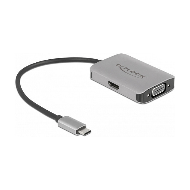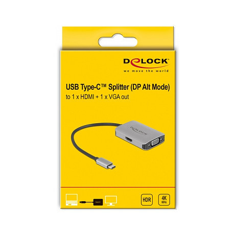 "DeLOCK USB Type-C Splitter (DP Alt Mode) > 1 x HDMI + 1 x VGA out. Video port type: USB Type-C, Video out: 1x HDMI + 1x VGA. Maximum resolution: 3840 x 2160 pixels, Product colour: Black, Grey, HD type: 4K Ultra HD. Width: 46 mm, Depth: 65 mm, Height: 14 mm. Quantity per pack: 1 pc(s), Package type: Box"\n"This splitter by Delock is suitable for the connection of a VGA monitor and an HDMI monitor to a computer with USB-C interface and DisplayPort alternate mode support. Two monitors can be operated simultaneously at the outputs, the same image is displayed on all ports."