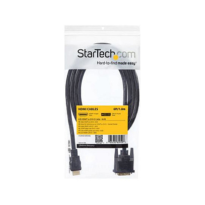 "StarTech.com 6 ft HDMI to DVI-D Cable - M/M. Cable length: 1.8 m, Connector 1: HDMI, Connector 2: DVI-D. Compliance certificates: RoHS, Certification: CE, REACH. Weight: 167 g, Width: 35 mm, Height: 15 mm. Package width: 200 mm, Package depth: 220 mm, Package weight: 172 g. Quantity per pack: 1 pc(s)"\n"Connect an HDMI-enabled output device to a DVI-D display, or a DVI-D output device to an HDMI-capable display
