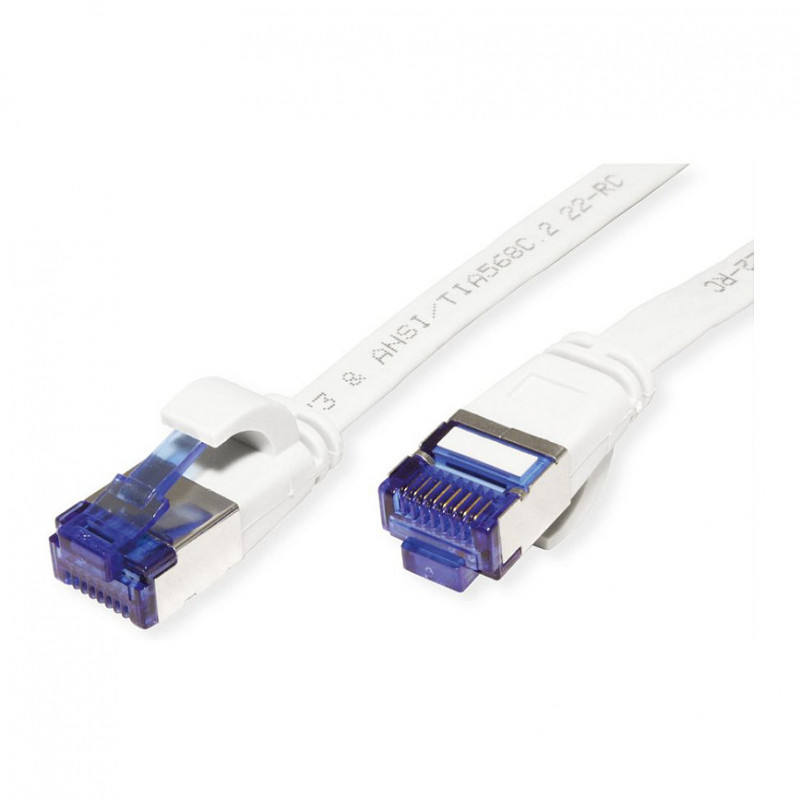 "VALUE 21.99.2163. Cable length: 3 m, Cable standard: Cat6a, Cable shielding: F/UTP (FTP), Connector 1: RJ-45, Connector 2: RJ-45, Connector contacts plating: Gold, Product colour: White"\n"Prepared flat cable with shielded RJ-45 plug on both ends"