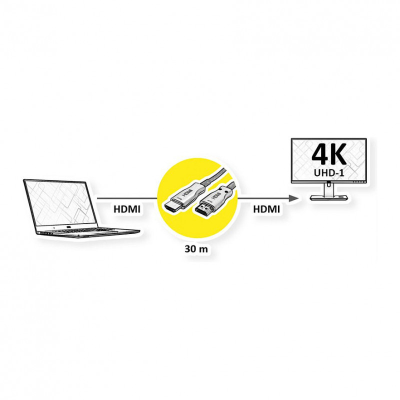 "VALUE 14.99.3481. Cable length: 30 m, Connector 1: HDMI Type A (Standard), Connector 1 gender: Male, Connector 2: HDMI Type A (Standard), Connector 2 gender: Male, HDMI version: 2.0, 3D, Product colour: Black"\n"With our UHD (3840x2160 @60Hz) capable HDMI fiber cable you have the possibility to establish a connection of up to 30m between your devices. The active cable (AOC) does not require a separate power supply and is particularly well suited for routing in a cable duct."