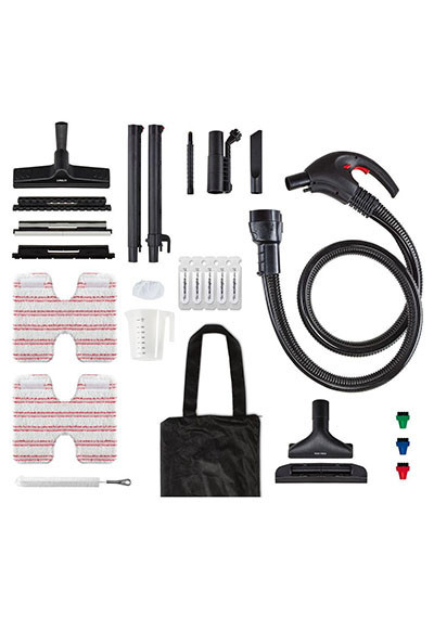 15 included accessories: universal brush with frames, steam + vacuum nozzle, window cleaning accessory 200 mm, steam concentrator + small nylon brush, steam lance, suction lance, 3 small coloured nylon brushes, cloth for all floors, sockette, jug, tank cleaning brush, accessory storage bag, 5 vials of bioecologico. |