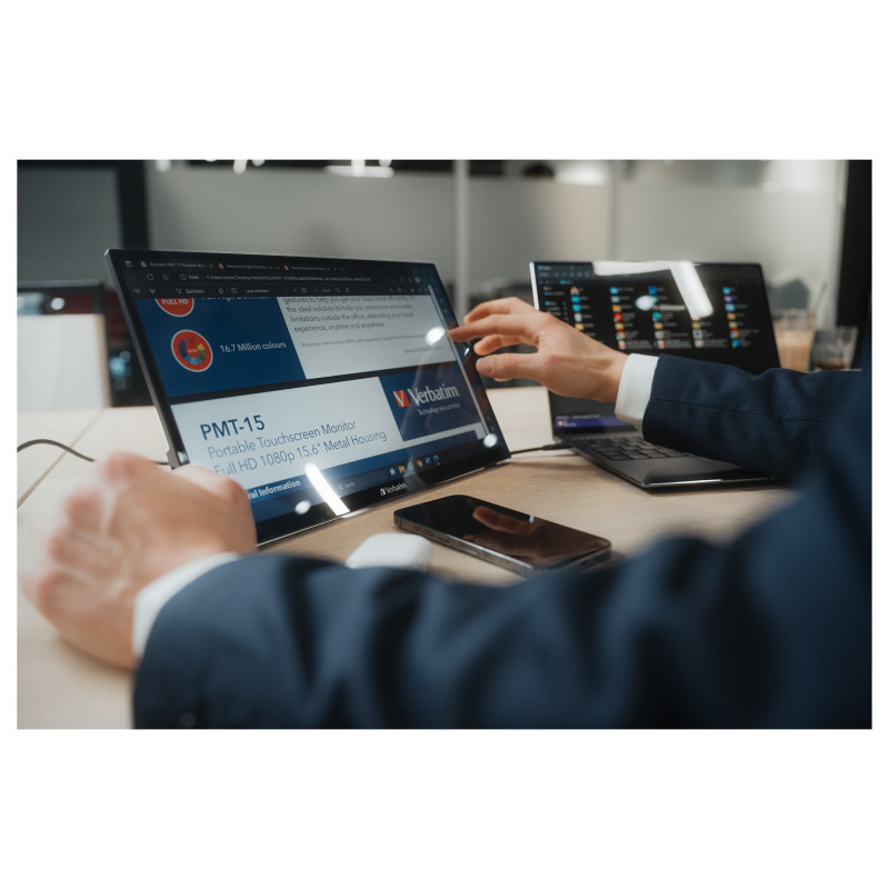 The Verbatim Portable Touchscreen Monitor gives you an extra dimension for your work and play. You can use it as a second screen for your laptop when you are travelling or giving one-on-one presentations, or to provide a large additional display for your phone, tablet, or portable gaming system. Compact and versatile, the portable monitor gives you ultimate flexibility for increased productivity and entertainment while on the go.