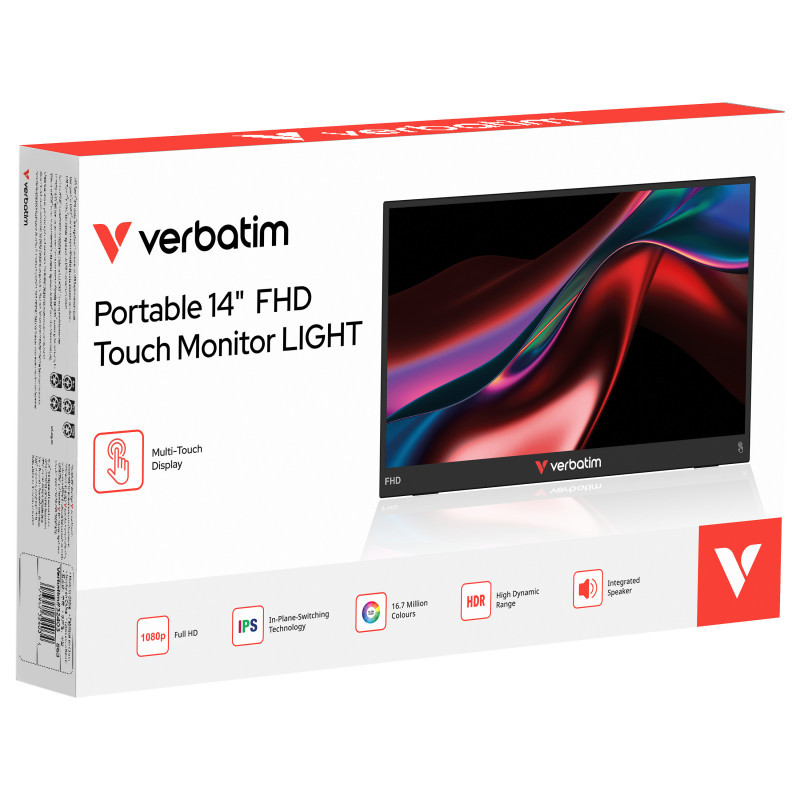 "Verbatim Portable 14"" FHD Touch Monitor LIGHT. Display diagonal: 35.6 cm (14""), Display technology: LCD, Display resolution: 1920 x 1080 pixels. RMS rated power: 1 W. USB port type: USB Type-C, Headphone connectivity: 3.5 mm. Product type: Portable monitor, Product colour: Black, Housing material: Plastic. Power consumption (typical): 10 W, Energy efficiency class (SDR): A, Power source type: DC"\n"Portable 14"" Touch monitor with Full HD resolution of 1920 x 1080 and 16.7 million colours. Supports capacitive 10-point multi-touch; simply connect the monitor to your device using a USB-C cable. IPS panel with 178 wide viewing angle and 16:9 aspect ratio. HDR technology improves picture quality creating a fantastic viewing experience. Great compatibilty for work/traveling/gaming: Connect the portable monitor to your PC/Mac/Tablet/Phones/Consoles with USB-C or HDMI. One Cable Soluttion: Plug and play setup of compatible devices via USB-C connection.Ultra-slim design with built-in speaker, audio jack and light weight. Neoprene sleeve is included.